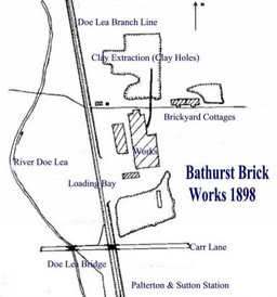 In the 1890's it would appear that a large supply of clay was to be found near to the river Doe Lea in Palterton this clay was extracted from deep excavations known as clay holes, a type of opencast mining, by boring and firing of explosives. The clay thus extracted would be ground and mixed with water. The clay would then be pressed and formed into moulds, dried and then fired in ovens. Several types of bricks were manufactured from the clays of the mudstones, silty mudstones and siltstones which were found above the Wales coal seam. The workings included twenty foot of silty mudstones and siltstone bands overlaying twenty five foot of mudstone and silty mudstone with ironstone bands and nodules. A good supply of water for washing and mixing with the clay, a coal mine for coal to burn to heat and dry the clay and the local railway to transport the bricks away from the site were all nearby.